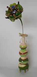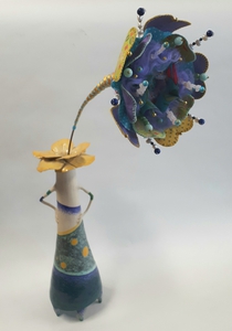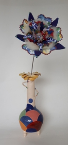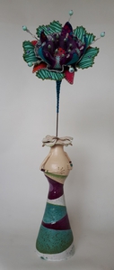 Bultrugvaasje met handgemaakte bloem van textiel.